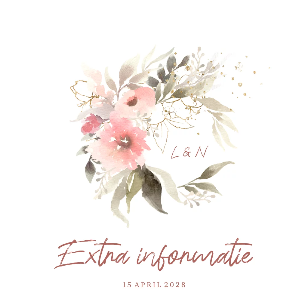 Bohemian soft inlegvel met extra informatie voor bij jullie trouwkaart met losse teksten, zachte pastel watercolor bloemen en goudlook bloemenkrans.