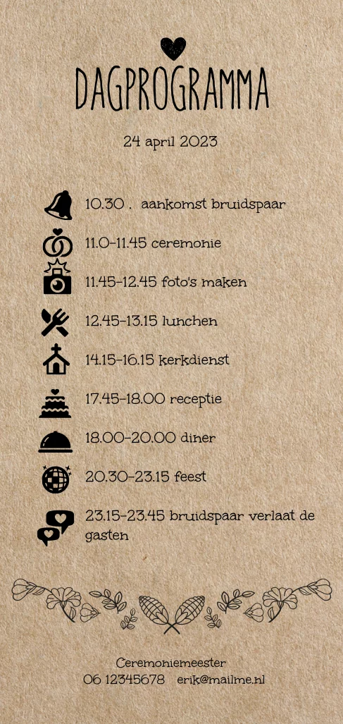 Stoere enkele kraft look grafische trouwkaart dagprogramma met out-line bloem, lijn, hartje en losse teksten. Extra lang formaat 10x21cm. Zelf maken.