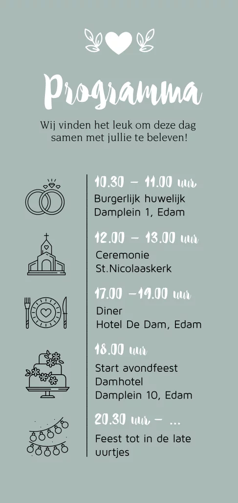Stijlvolle trouwkaart dagprogramma voor de gasten met prachtige trouw iconen. Extra lang formaat 10x21cm. Alles is zelf te bewerken. Veel mogelijkheden qua iconen.