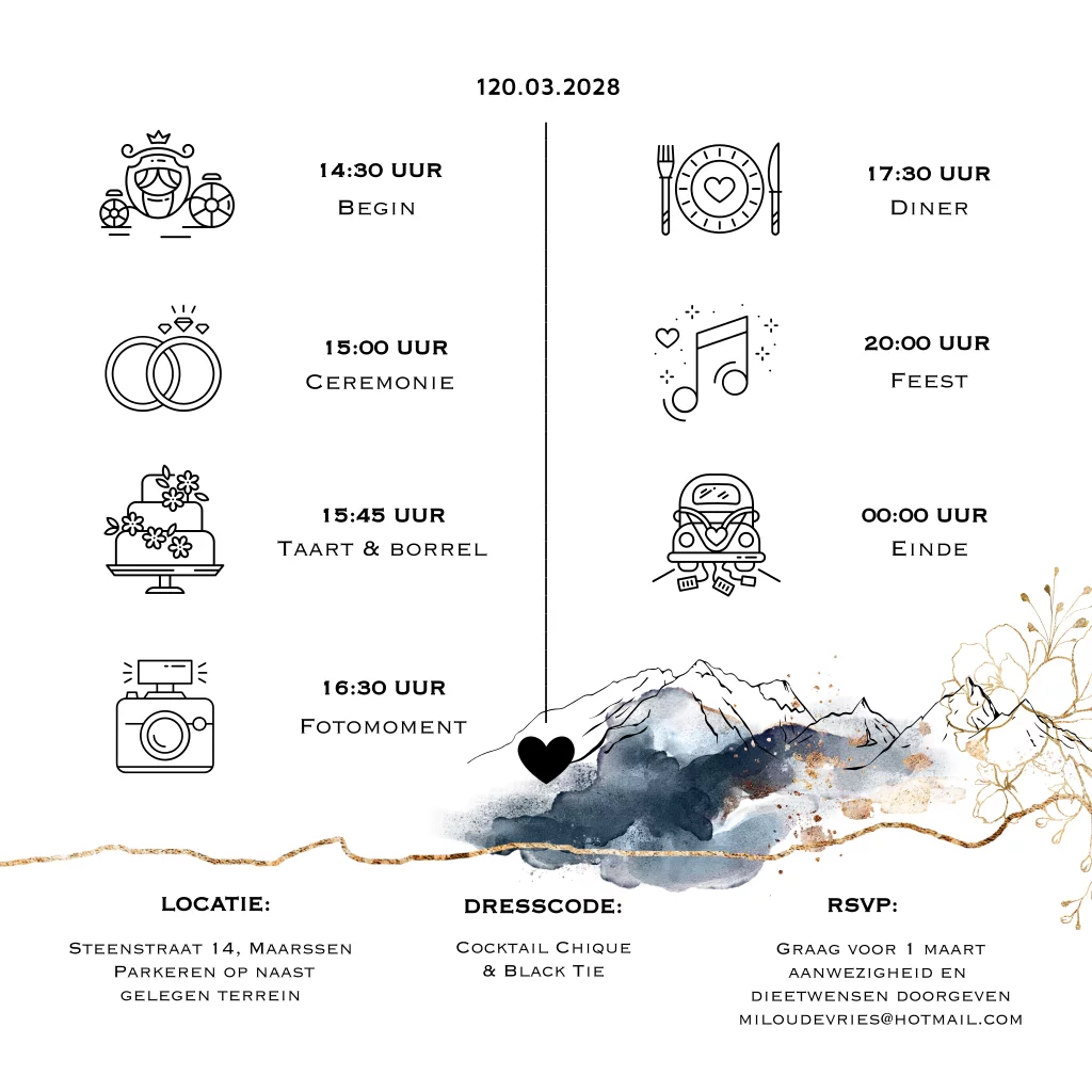 Prachtige rustige vierkante programma kaart met wedding icoontjes en een tijdlijn met bergen.