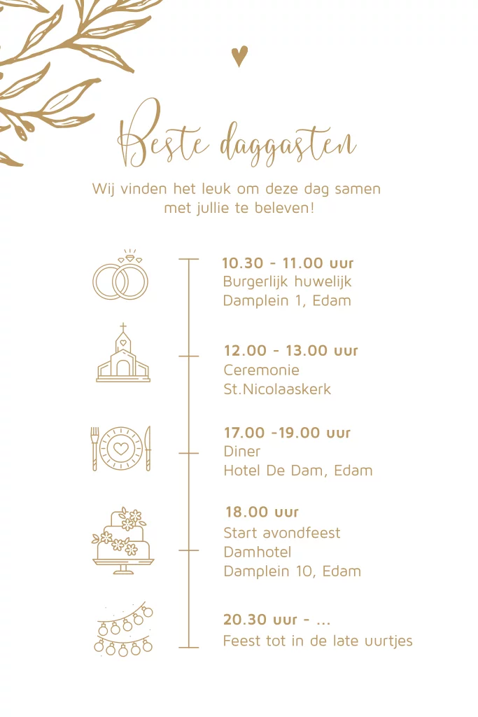 Witte trouwkaart dagprogramma voor de gasten met prachtige wedding iconen, takje en oker kleurige touch. Veel mogelijkheden qua iconen uit de beeldbank.