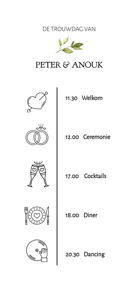 Langwerpige trouwkaart met iconen en blad element. Enkele kaart formaat 10x21cm. Genoeg ruimte voor tekst en iconen uit onze beeldbank.