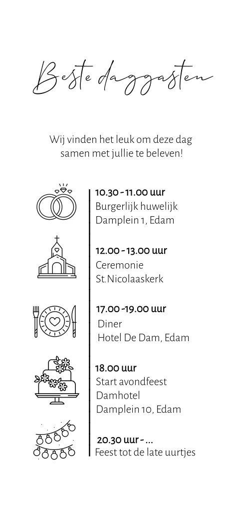 Langwerpige trouwkaart met iconen. Enkele kaart formaat 10x21cm. Genoeg ruimte voor tekst en iconen uit onze beeldbank.