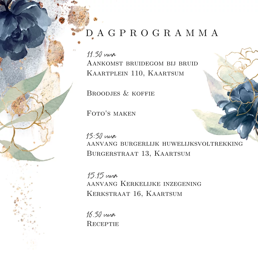 Sunset flowers trouwkaart met extra informatie over jullie bruiloft met blauwe watercolor bloemen, goudlook en bladeren. Zelf maken!