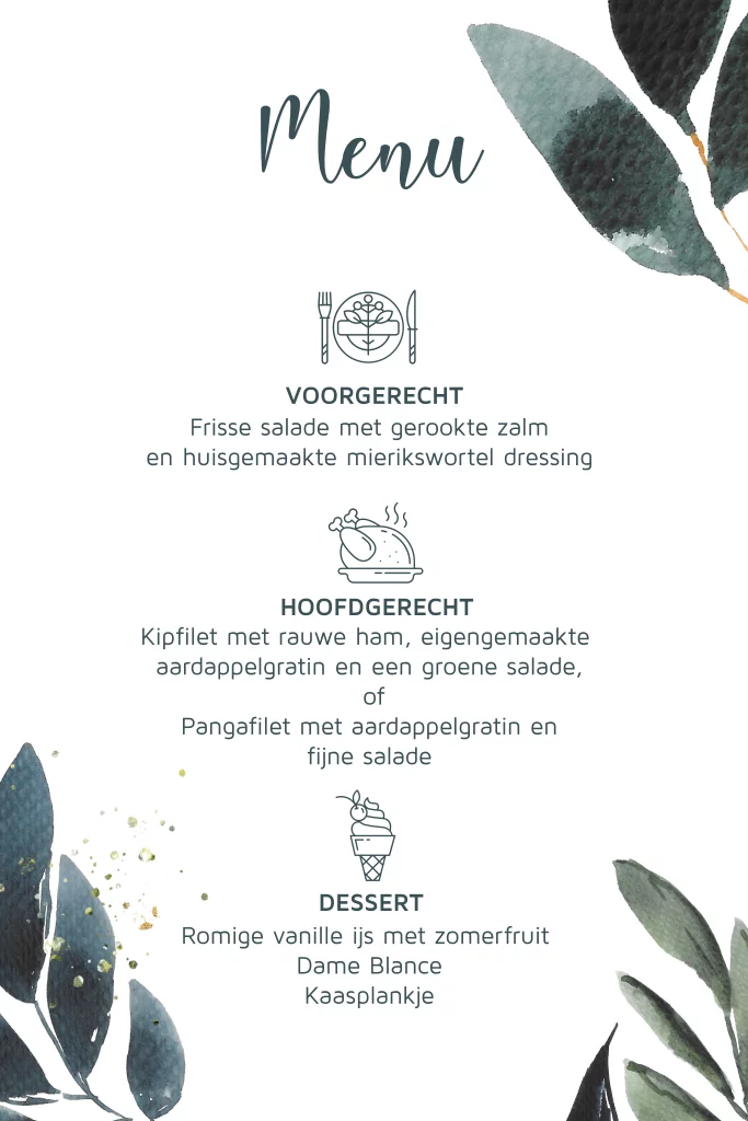 Opzoek naar een stijlvolle botanische menukaart? Met groen en blauwe watercolor blad op en witte ondergrond. Zelf maken!