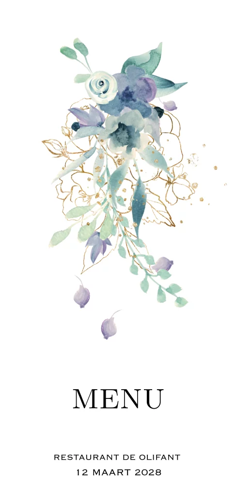 Stijlvolle enkele lang formaat menukaart met mint kleurige bloemen in watercolor stijl. Wil je liever de achtergrond met bergen of de goudkleurige letters gebruiken die bij deze huisstijl horen? Kijk dan in onze editor onder 'Alfabet Gold Flowers set' en 'Dreamy Mountains'. Kies je eigen afbeeldingen en maak jullie eigen trouwkaart.