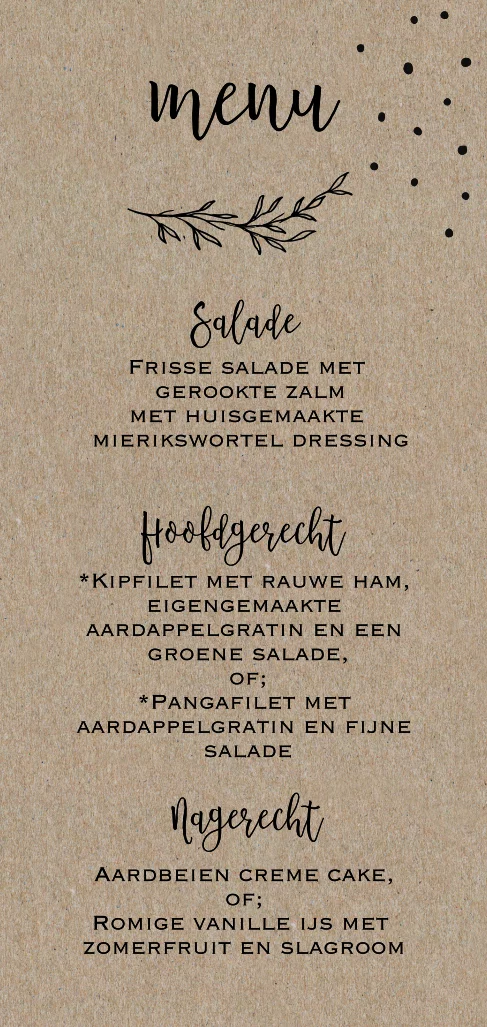 Moderne enkele echt kraft menukaart met out-line bloem en sierletters. 2-zijdes die je kan opmaken! (langwerpig formaat 10x21cm)