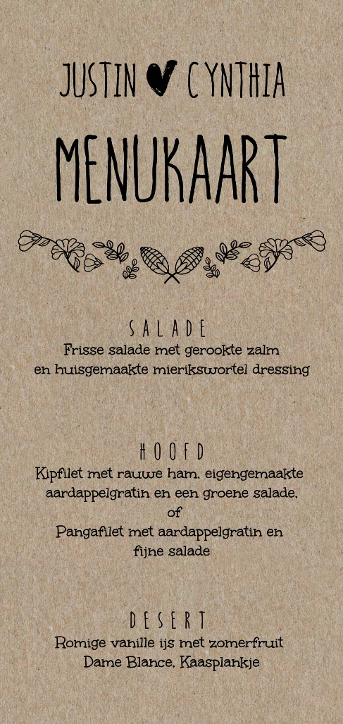 Echte kraft papier menu dinerkaart voor op tafel bij jullie bruiloft? Met getekende blaadje. Zelf maken!