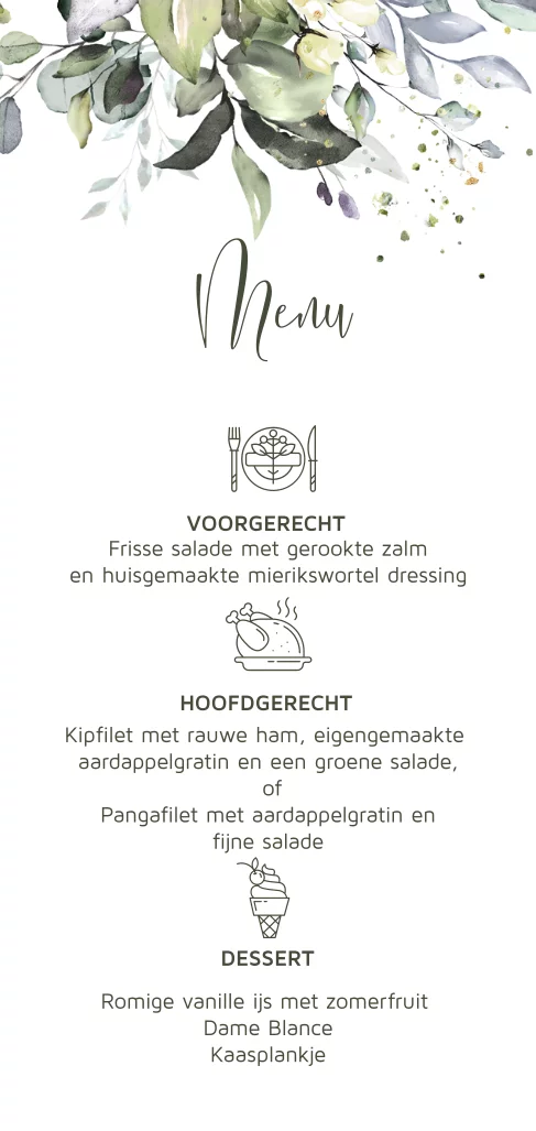Natural menu en drank kaart voor de gasten met prachtige eet iconen en eucalyptus blad. Formaat 10x21cm. Veel mogelijkheden qua iconen uit de beeldbank.