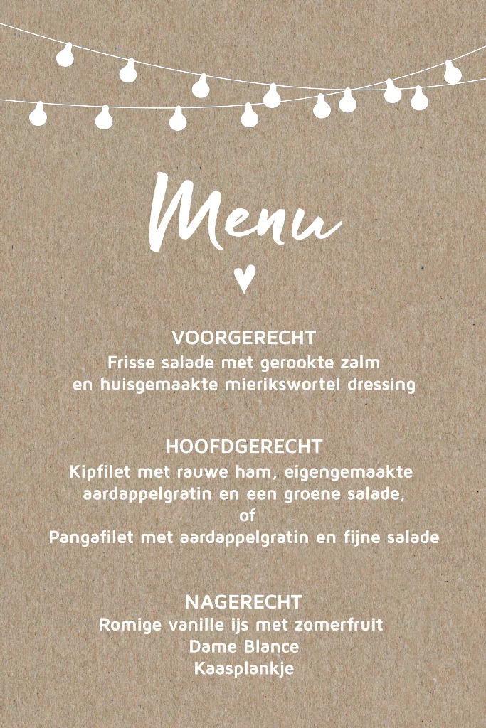 Festival lampjes menukaart trouwen op kraft papier