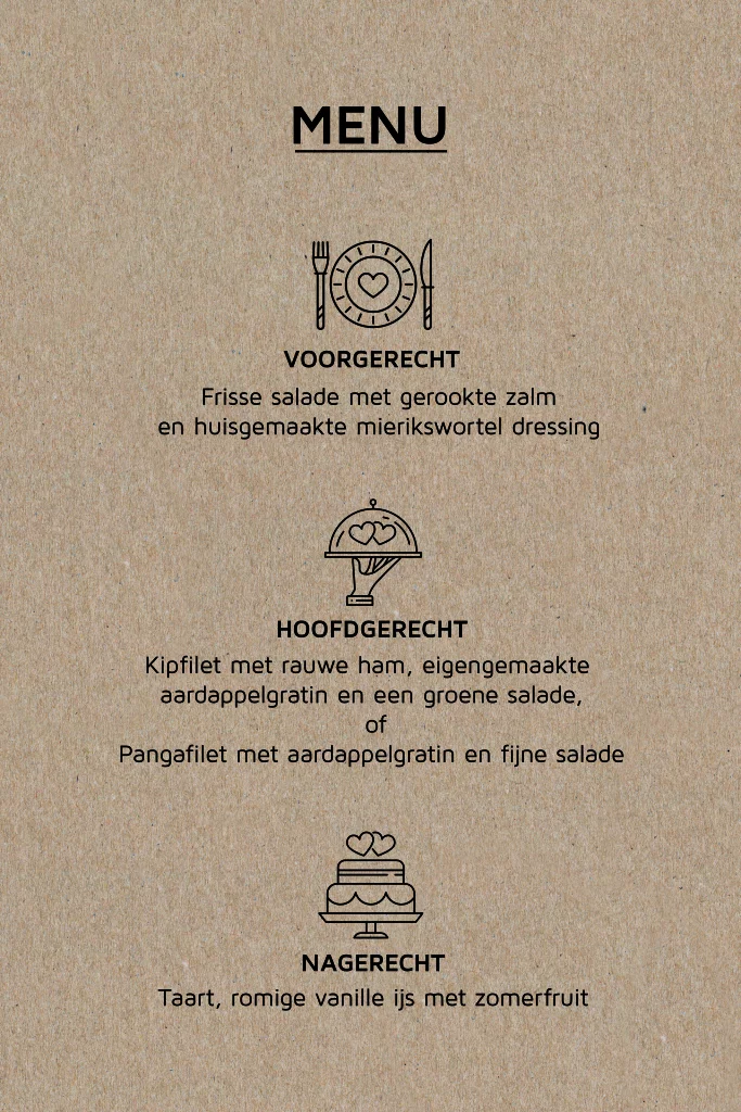 Modern dinerkaart gedrukt op echt kraft papier voor op tafel bij jullie bruiloft? Rustig kaartje voor menu en drank met tekst en iconen. Er zijn veel wedding iconen beschikbaar in onze beeldbank. Alles is zelf te bewerken!