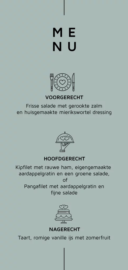 Modern minimalistische dinerkaart voor op tafel bij jullie bruiloft? Rustig kaartje in een trendy (wissel kleur) voor menu en drank met tekst en iconen. Er zijn veel wedding iconen beschikbaar in onze beeldbank. Alles is zelf te bewerken!