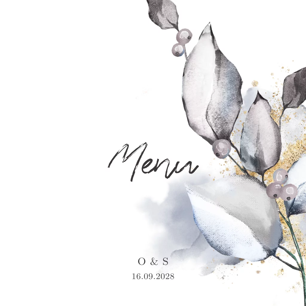 Opzoek naar een stijlvolle menukaart? Romantische huwelijksdiner aankondiging met watercolor paars blad en goudlook poeder brush.