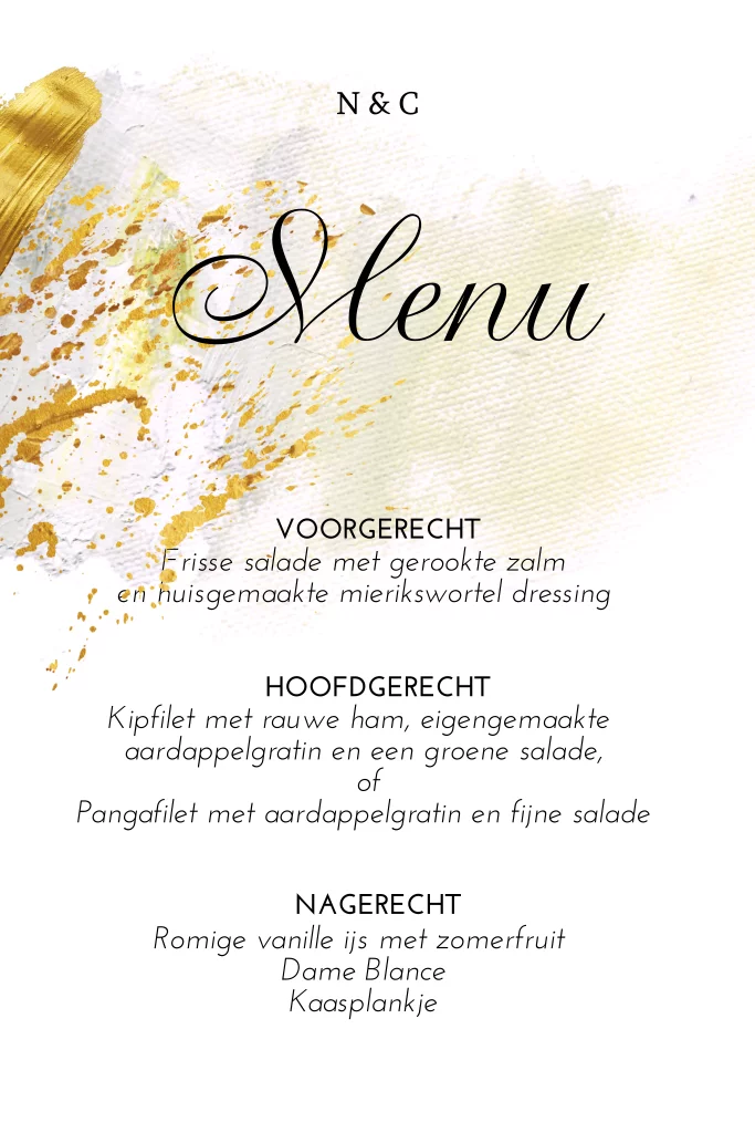 Oil painting dinerkaart voor op tafel bij jullie bruiloft? Op de achtergrond aquarel in geel en goudkleur. Zelf maken!