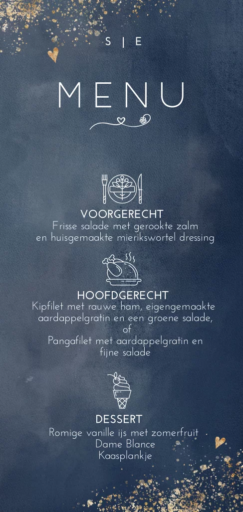 Menukaart navy blue waterverf met goudlook spetters