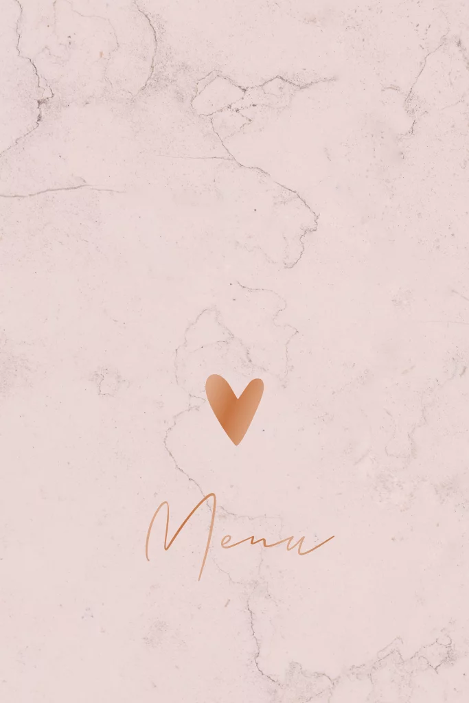 Unieke enkele menukaart met koper hartjes en marmer look