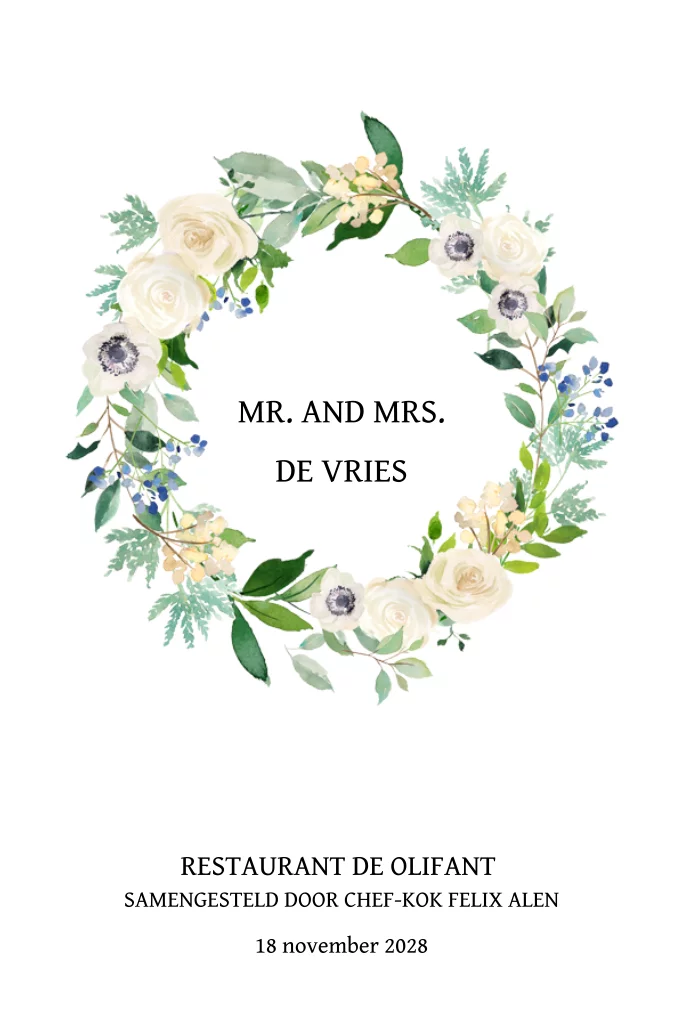 Opzoek naar een unieke spijskaart voor jullie bruiloft? Stijlvolle menukaart met bloemen krans in watercolor stijl en tekst lint in pastel tint. In onze beeldbank vind je meerdere bloemenkransen.