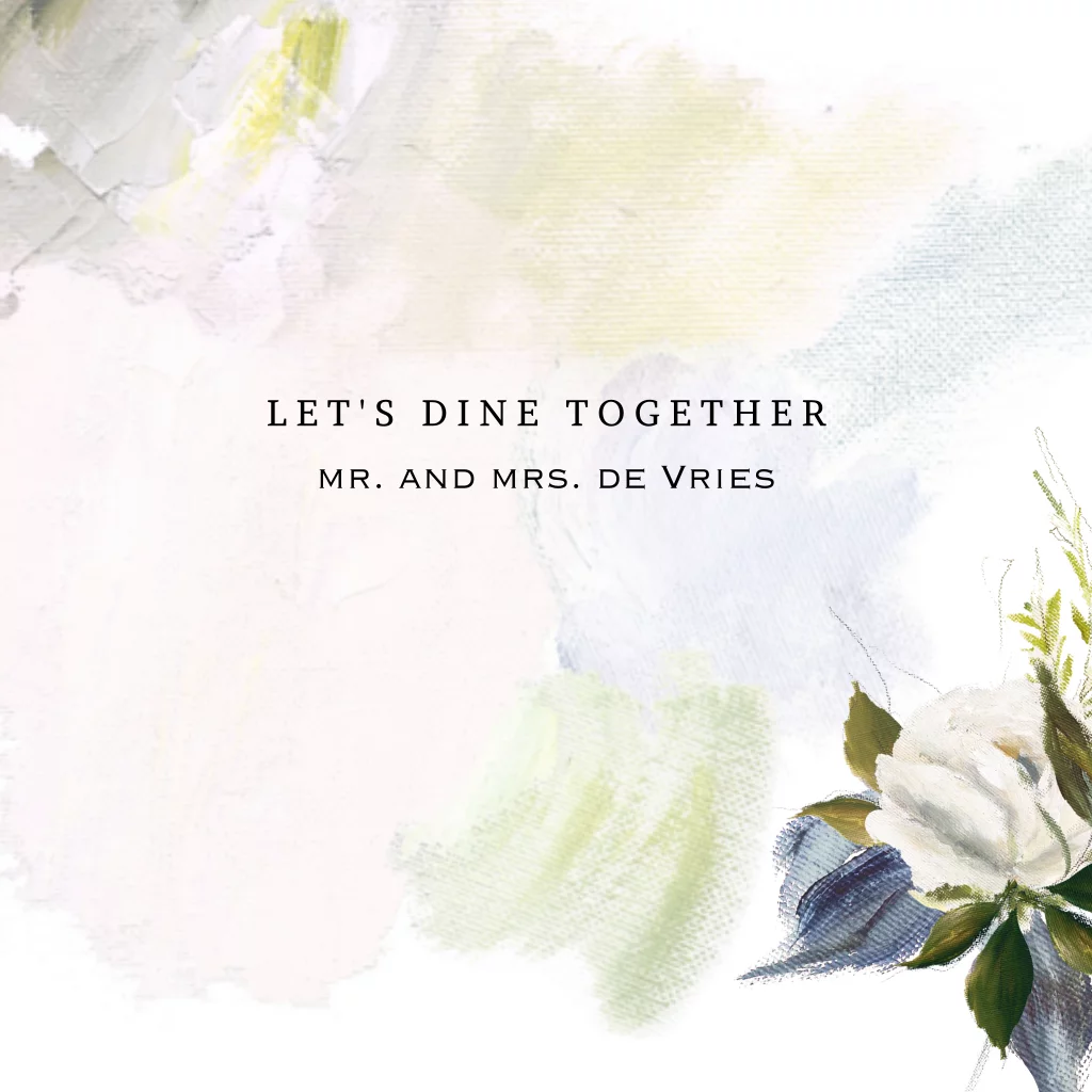 Opzoek naar een eenvoudige maar toch chique menu kaart? Romantische huwelijksdiner aankondiging met canvas look achtergrond. Versierd met verf en bloemen in olieverf look.
