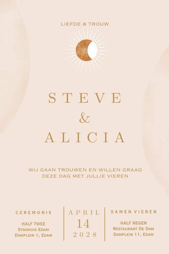 Opzoek naar een moderne trouwkaart met aardetinten? Met maan en zon afbeelding op een taupe, rose white ondergrond. Zelf maken!