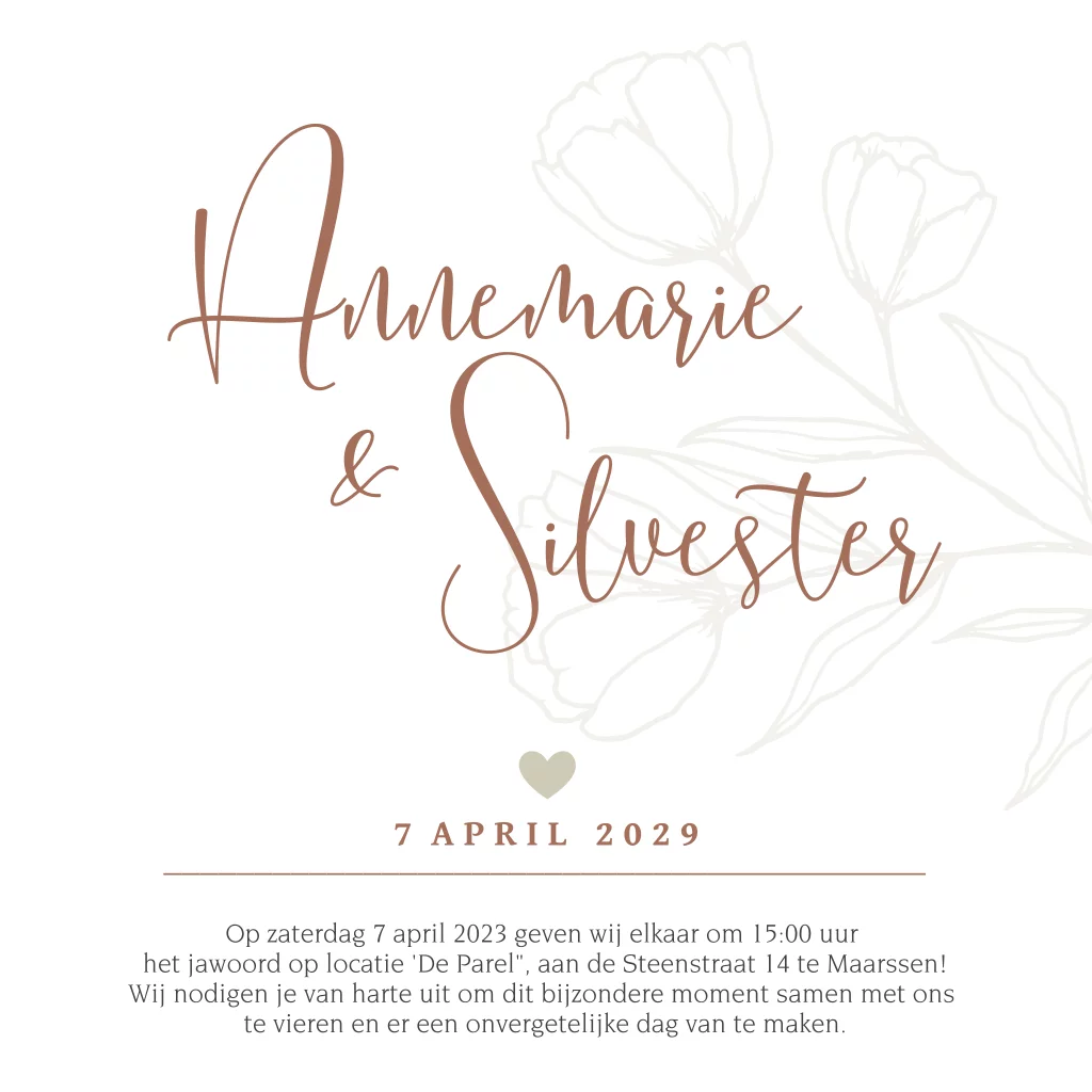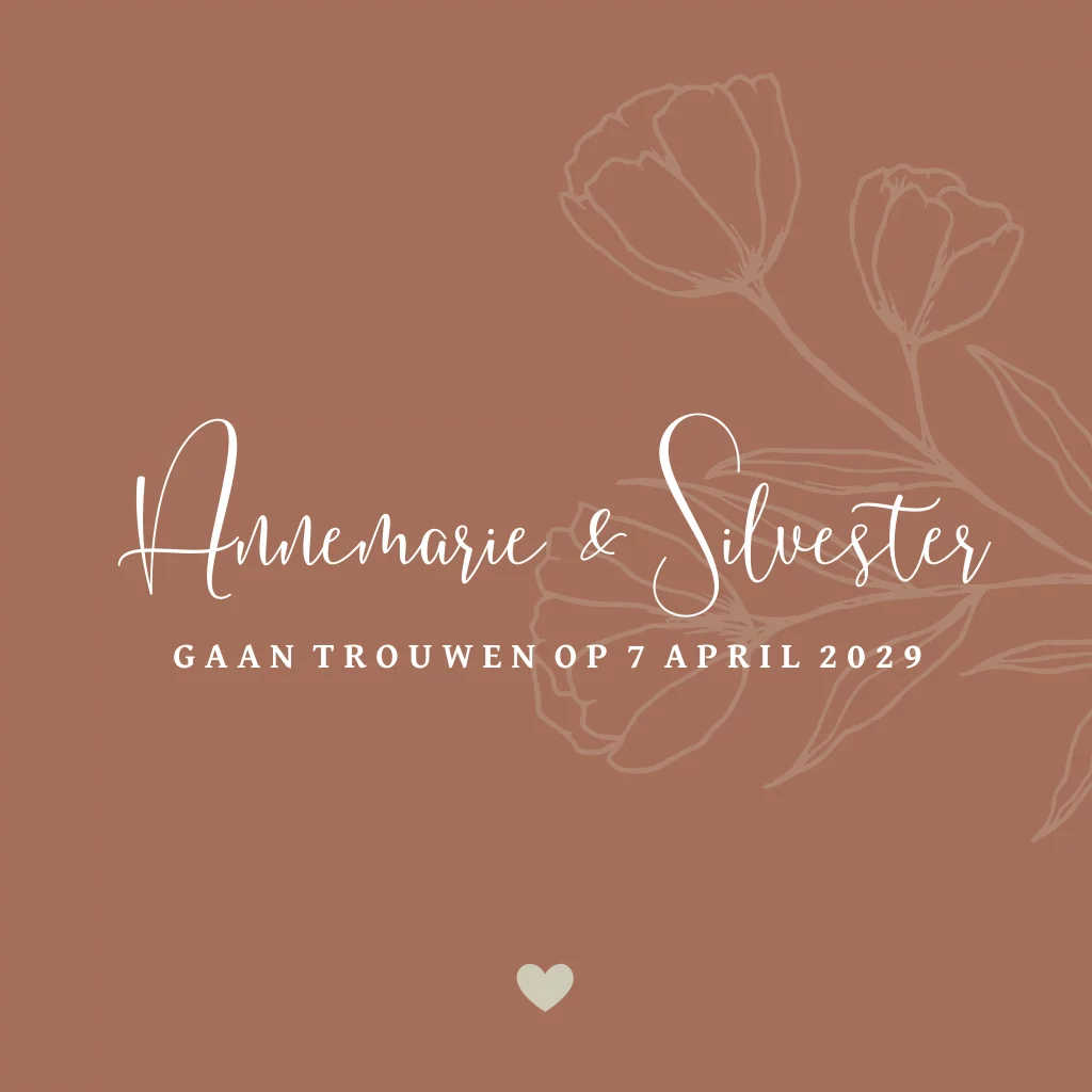Trendy trouwkaart nu met een prachtige warme tint brons op de ondergrond en botanische silhouet takjes. Alle wedding iconen zijn te vervangen, zie de beeldbank.