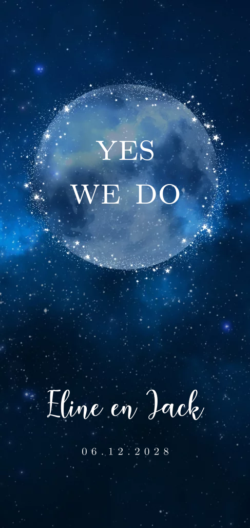 Stijlvolle starry night blauwe trouwkaart met maan, sterrenhemel en sterren cirkel en wedding icoontjes. Dubbele kaart formaat 10x21cm. Genoeg ruimte voor tekst en foto's.