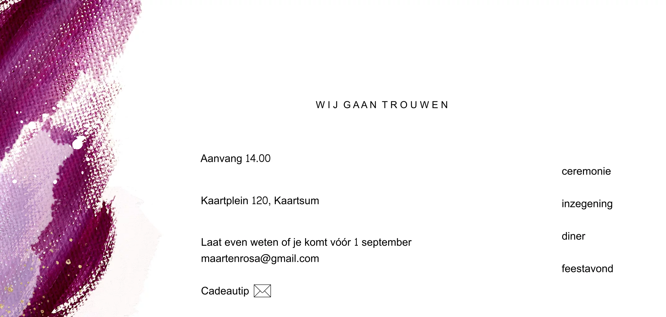 Moderne strakke trouwkaart met strak lettertype. Canvas texture verf strepen in kersenrood. Alles staat los en is te bewerken.