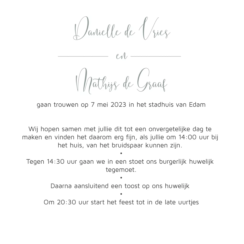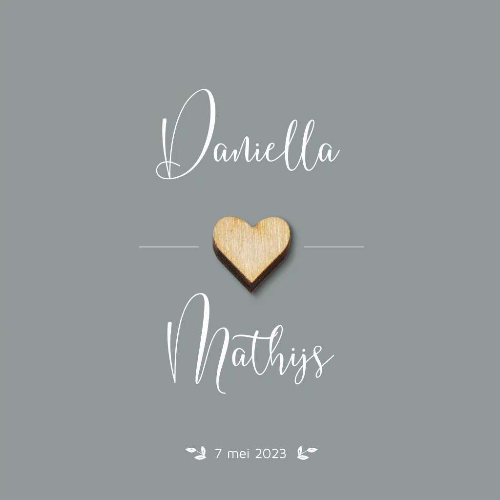 LET OP: Het houten vormpje op dit kaartje wordt niet mee gedrukt, deze is ter voorbeeld. Op die plek kun je straks zelf het échte houten vormpje plakken. Bij je proefdruk krijg je samples van alle kleuren strikjes en houten vormpjes. Rustige trouwkaart in een warme aarde tint groen . Plak op de voorkant een echt houten hartje en maak zo dit kaartje uniek.