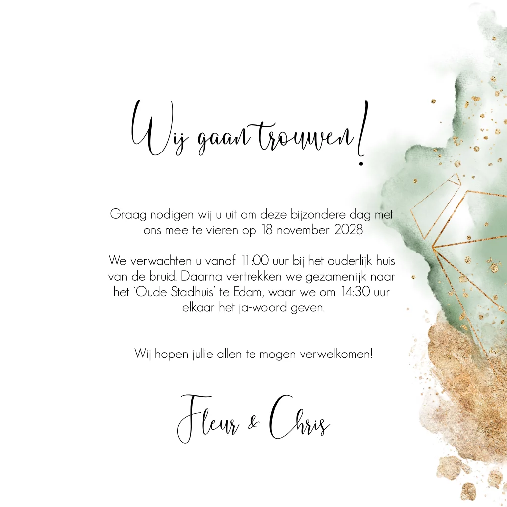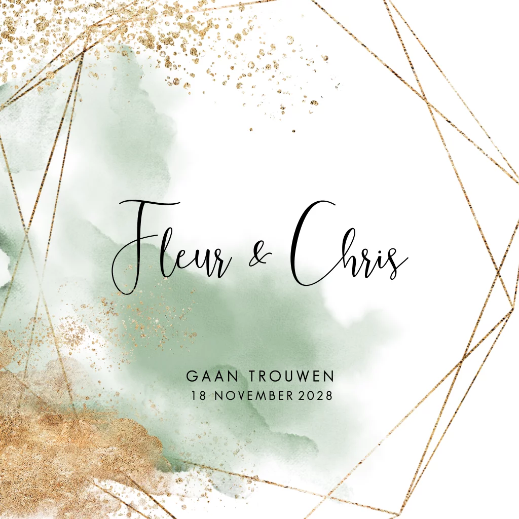 Geometrische trouwkaart met mint groene aquarel en goudkleurige (geen echt goud) lijnen, driehoeken en spetters. Alles staat los op deze prachtige kaart.