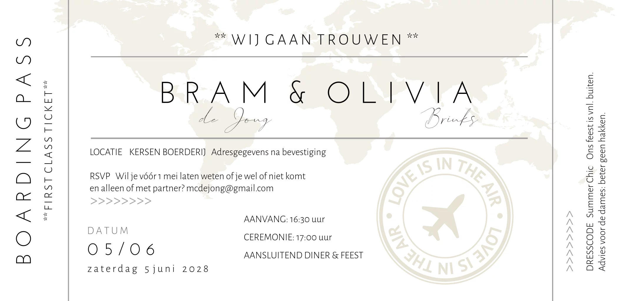 Trouwkaart in de vorm van een boarding pass. Met lijnspel en beige tinten.