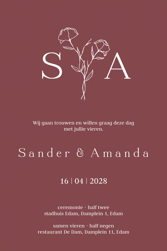 Opzoek naar een moderne rustige trouwkaart in een effe kleur? Met roest bruine ondergrond die jezelf kan aanpassen. De takjes en andere elementen staan in de beeldbank, zo maakt je de trouwkaart nog persoonlijker. Zelf maken!