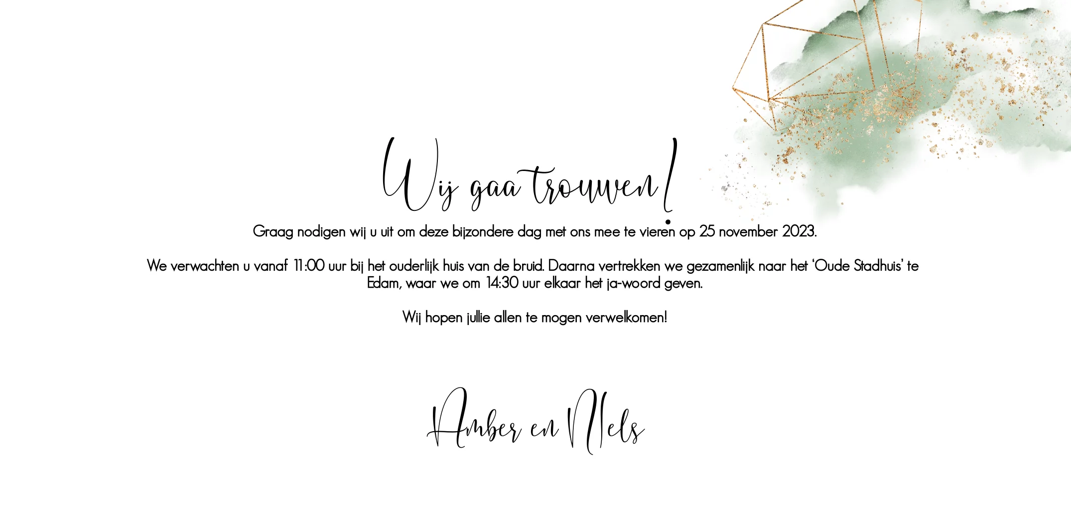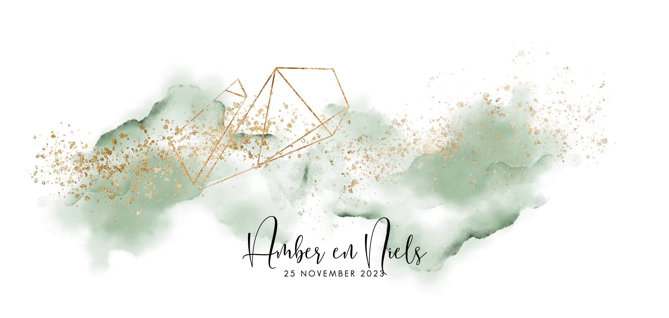 Stijlvolle trouwkaart met groene aquarel en goudkleurige (geen echt goud) spetters en geometrische vormen. Dubbel panorama formaat zelf maken. Alles staat los op deze prachtige kaart.