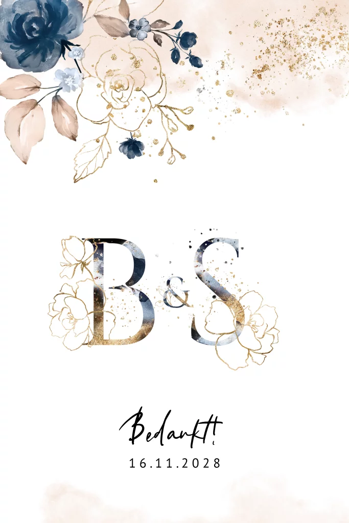 Romantisch bedankkaartje nasturen met jullie mooiste trouwfoto! Met zacht roze en donkerblauwe watercolor en in goudkleur getekende bonte bloemen. Initialen van de namen en foto op de achterzijde.