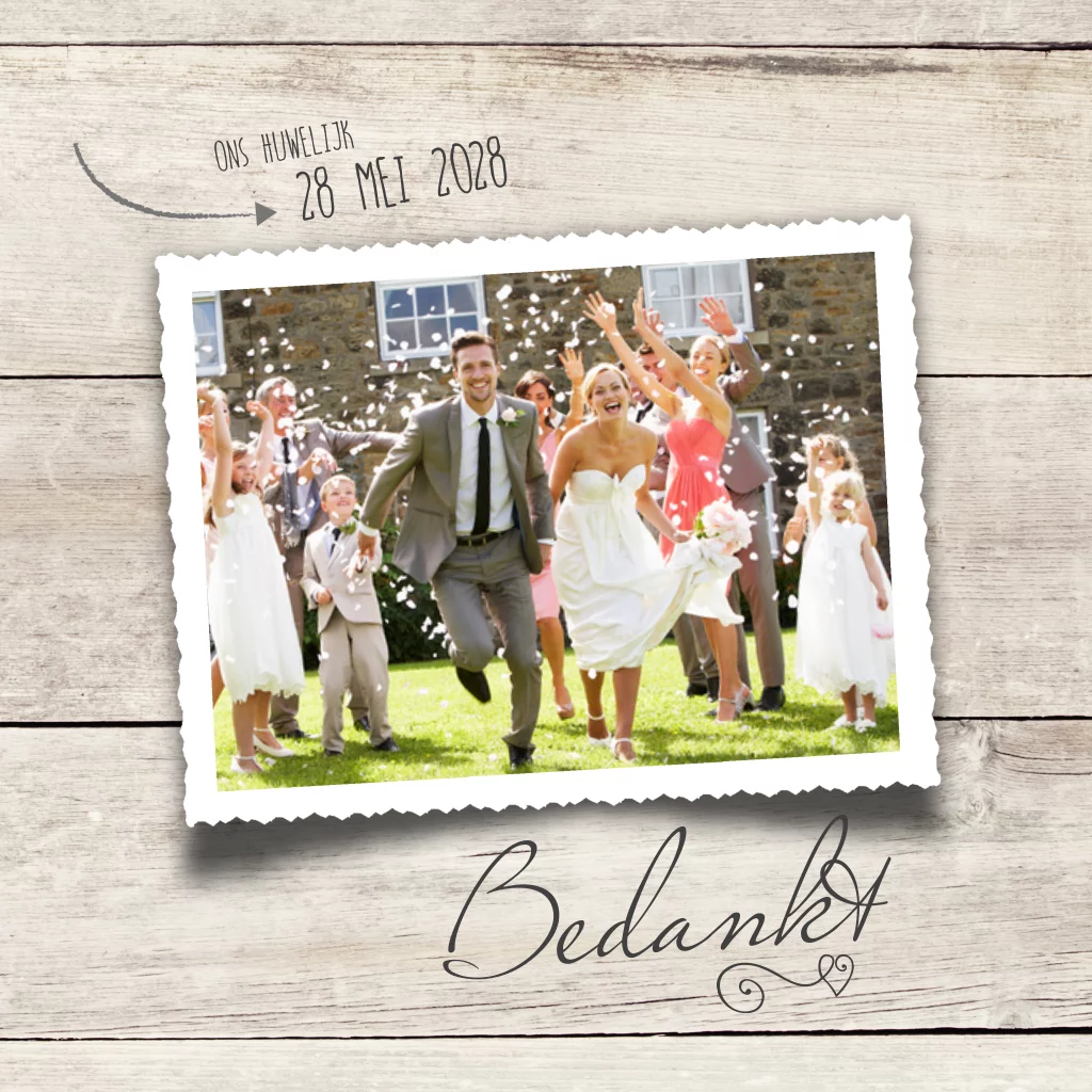 Hippe enkele bedankkaart voor jullie onvergetelijke trouwdag! Met foto kader en houten print. Alles op deze kaart is aan te passen! Vervang de voorbeeld foto.