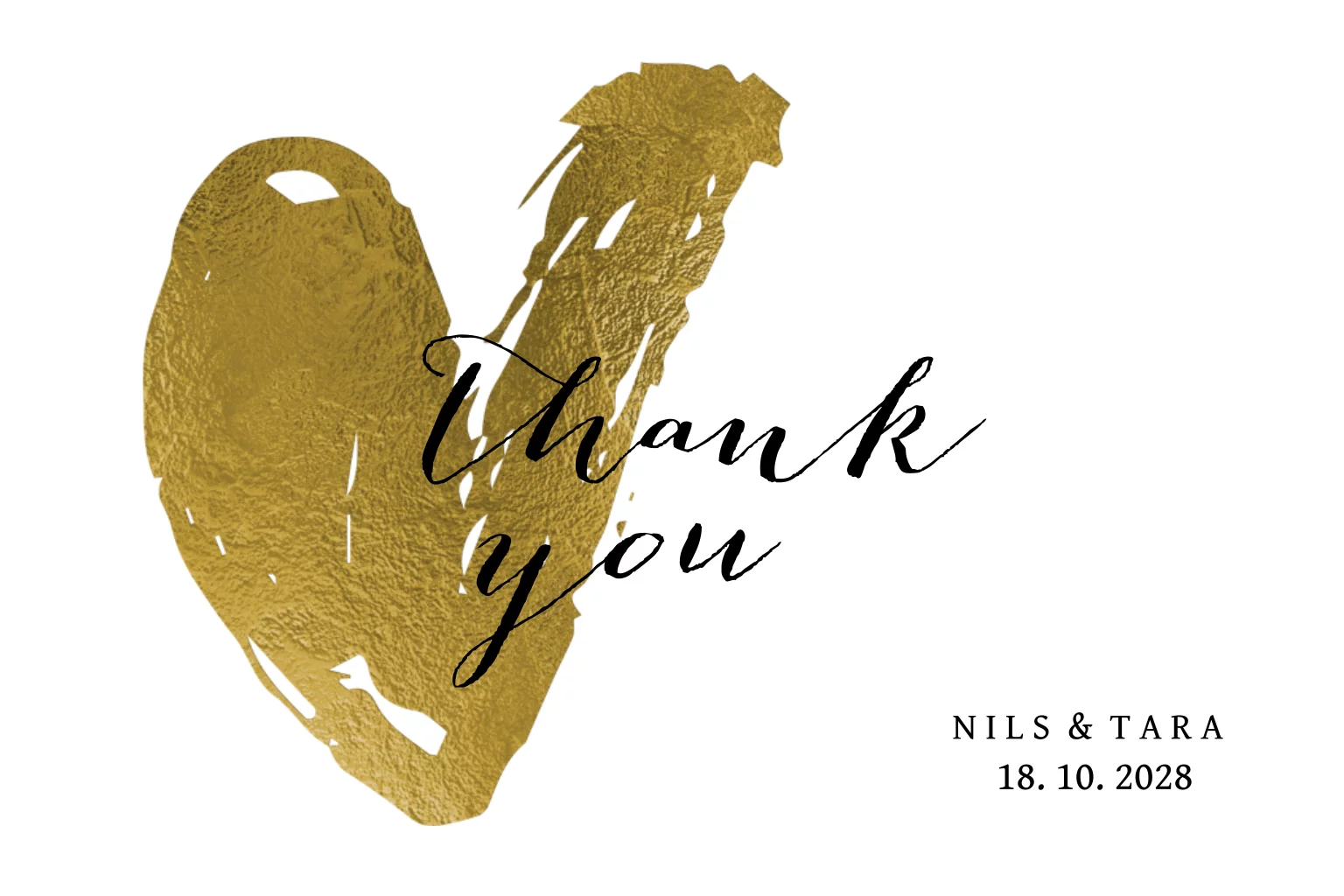 Stijlvolle enkele bedankkaart van jullie onvergetelijke trouwdag! In zwart wit met een touch of goldlook! Versierd met goudfoli hart en goudlook waterverf (geen echt goud) Alles op deze kaart is aan te passen!