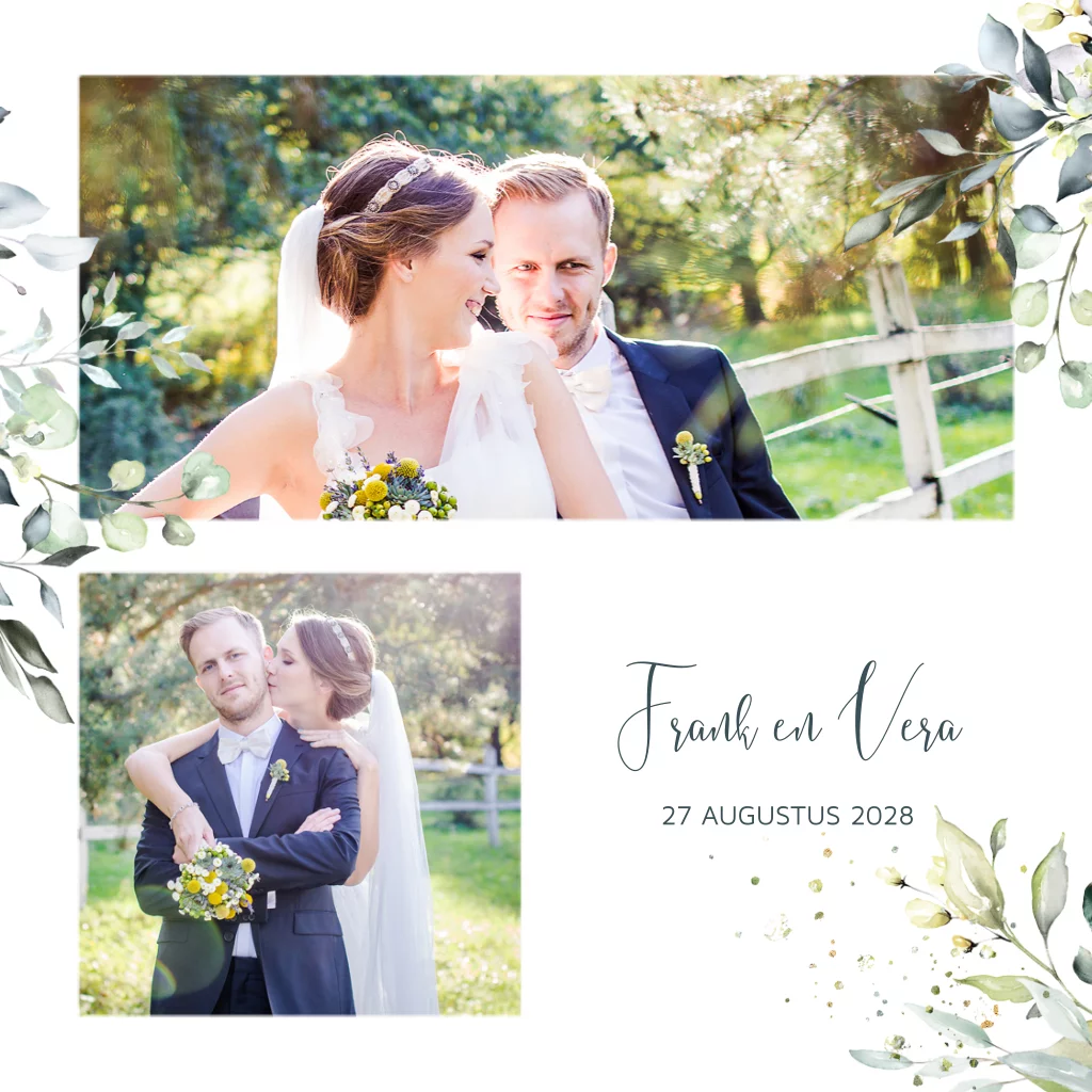 Stuur je mooiste trouwfoto's als bedankkaart in eucalyptus greenery stijl naar je gasten als aandenken.. Met prachtige aquarel bladgroen speels en los op de pagina. Zelf maken!