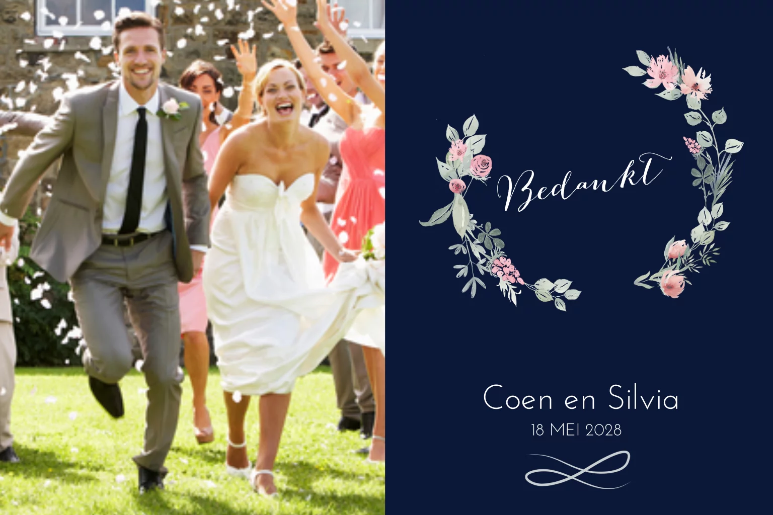 Enkele romantic chic donker blauwe bedankkaart van jullie onvergetelijke trouwdag! Met foto ruimte, watercolor bloemen en sierletters. Alles op deze kaart is aan te passen! Vervang de voorbeeld foto.