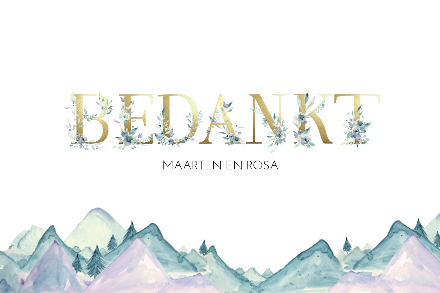 Enkele Dreamy Mountain bedankkaart van jullie huwelijk. Goudkleurige letters (geen folie druk) 'Bedankt' en bergen achtergrond. Op de achterzijde kun je meerdere foto's van jullie bruiloft plaatsen of een tekst plaatsen. Gebruik je liever een fotokader? Ga in onze editor naar 'Fotokaders' en kies er een uit.