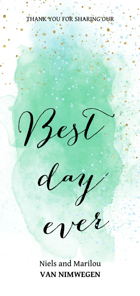 Romantische bedankkaart met groene aquarel en blauw en goudgekleurde spetters. Met leuke voorbeeld tekst en mogelijkheid voor plaatsen van eigen foto's op de achterzijde. Zelf maken!