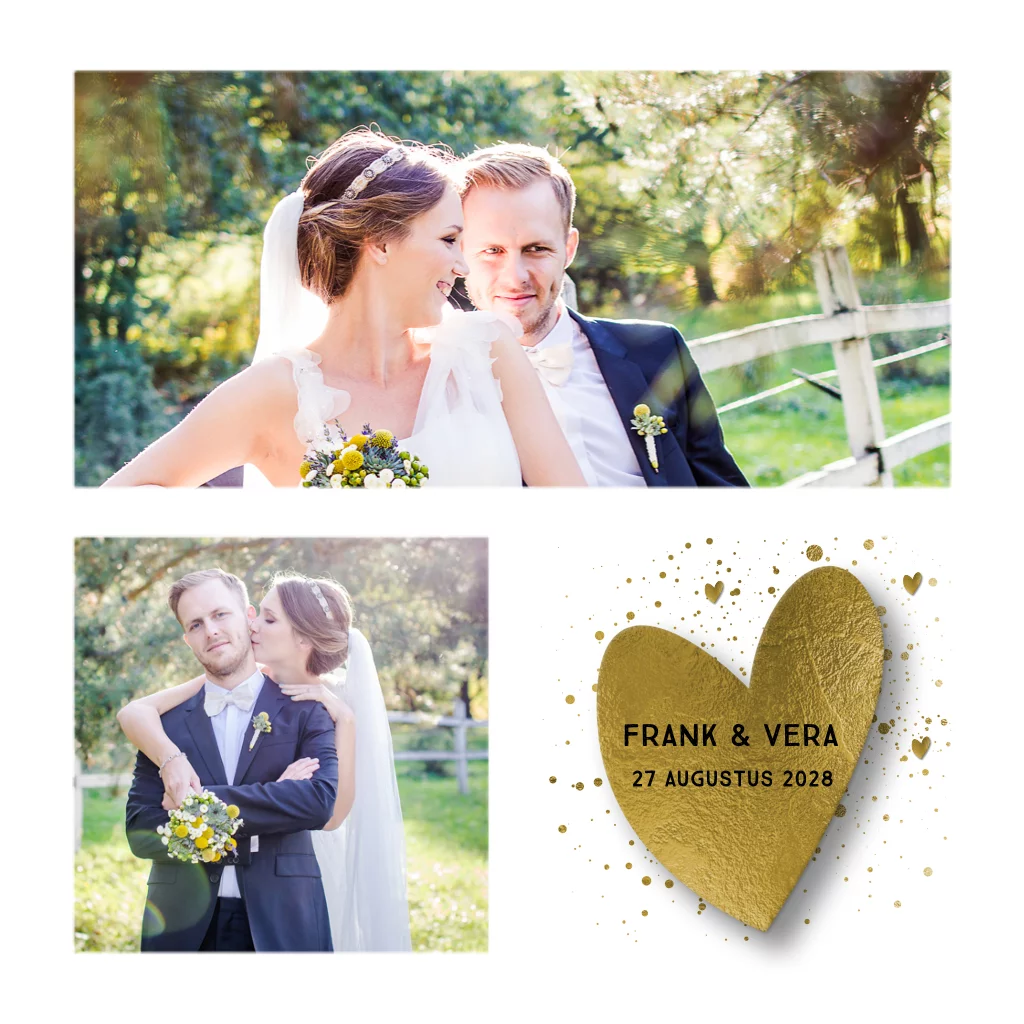 Stijlvolle trouw bedankkaart met eigen fotos en goudkleurig hart
