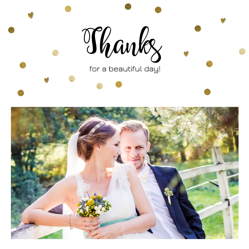 Stuur je mooiste trouwfoto als bedankkaart naar de gasten van jullie bruiloft. Versierd met goudkleurige confetti (geen echt goud). Upload je eigen foto en vul je eigen tekst in!