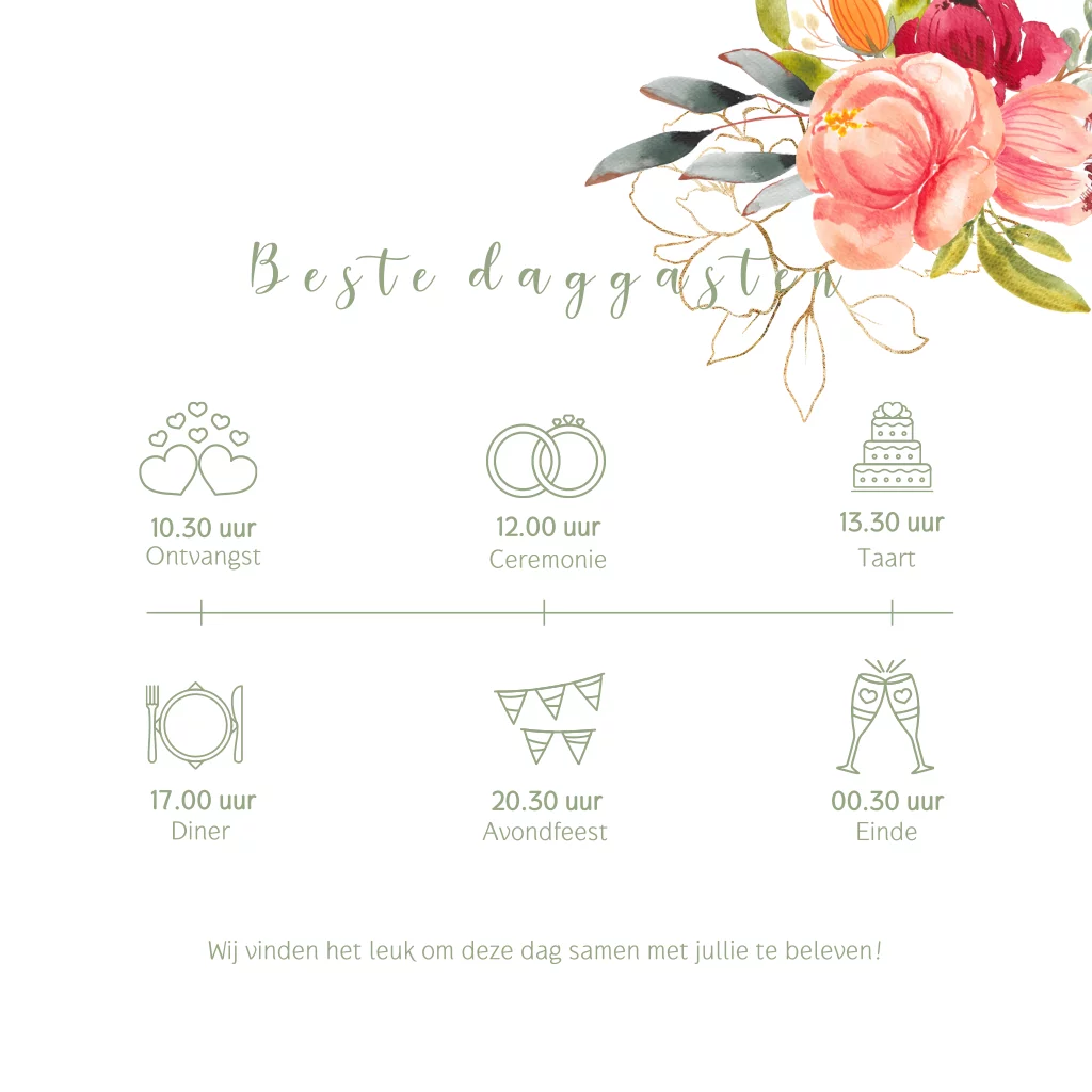 Rustig enkel watercolor bloem boeket bonte kleuren trouwkaart dagprogramma voor de gasten met prachtige wedding iconen.