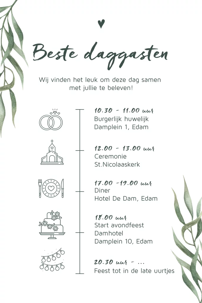 Witte trouwkaart dagprogramma voor de gasten met groen blad en prachtige trouw iconen. Veel mogelijkheden qua iconen.