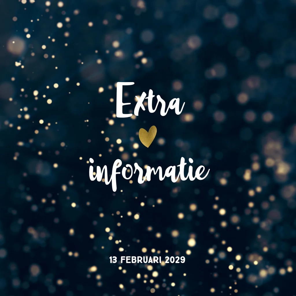 Chique uitnodiging voor jullie huwelijk met een los kaartje erbij met extra informatie? Met winter donker blauwe sterrenhemel met neon lichtjes op de ondergrond en speelste goud gekleurde glitter hartjes. Zelf maken!