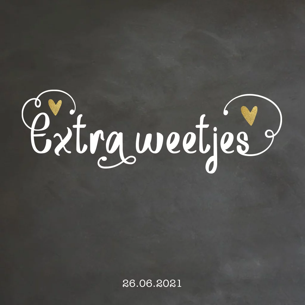 Enkele staande romantische krijtbord inlegvel bij jullie trouwkaart met losse teksten, sier krul, goud kleurige hartjes.