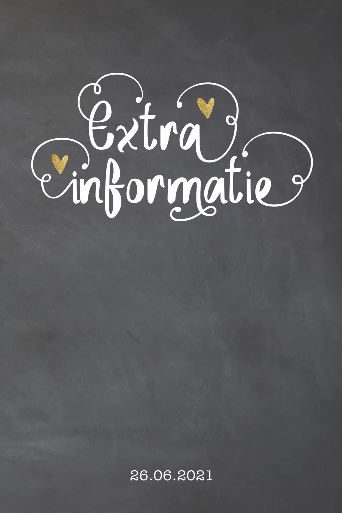 Enkele staande romantische krijtbord inlegvel bij jullie trouwkaart met losse teksten, sier krulhandlettering, goud kleurige hartjes.