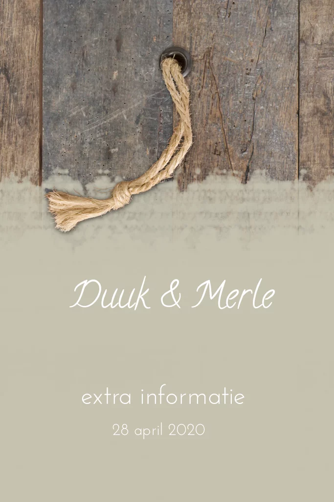 Hippe enkele brief bij trouwkaart met grove hout print, koortje en kleur vlak. Alles staat los op deze kaart. Kies de bv een kleur die past bij jullie stijl en thema.