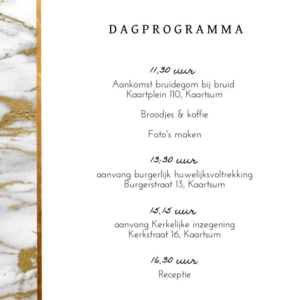 Unieke romantische trouwkaart met marmer goud folie look. (goud is een look). Trouwkaart met dag en avondprogramma, zelf maken!