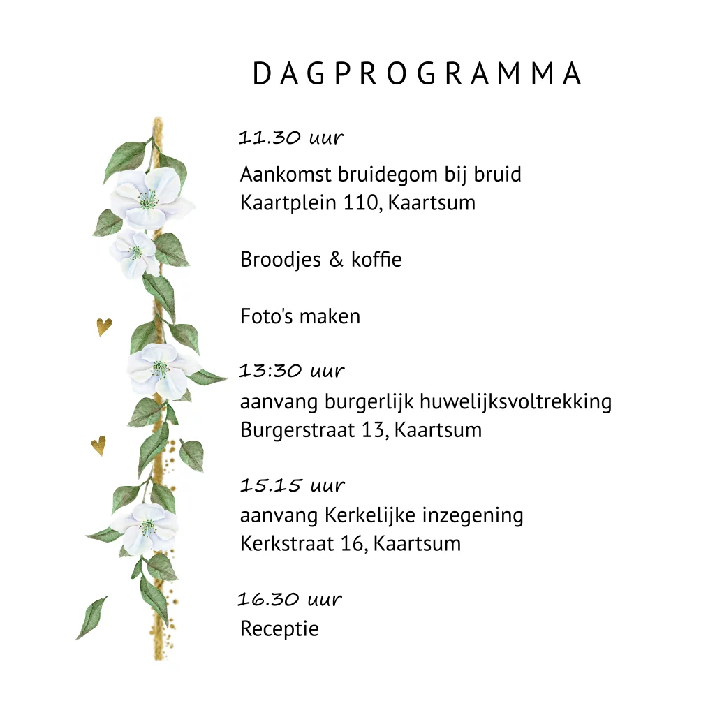 Unieke romantische trouwkaart met extra informatie over jullie bruiloft met staande bloemenpartij. Een gouden lijn (goud is een look). Trouwkaart met dag en avondprogramma voorbeeldtekst, zelf maken!