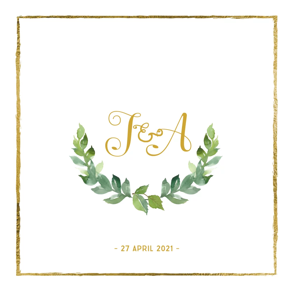 Stijlvolle trouwkaart goudfolie kader en eucalyptus plant