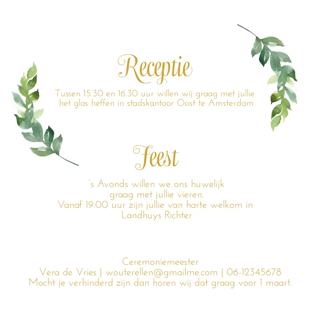 Prachtige botanische trouwkaart met aquarel Eucalyptus bladgroen met goudfolie look. Zelf maken!